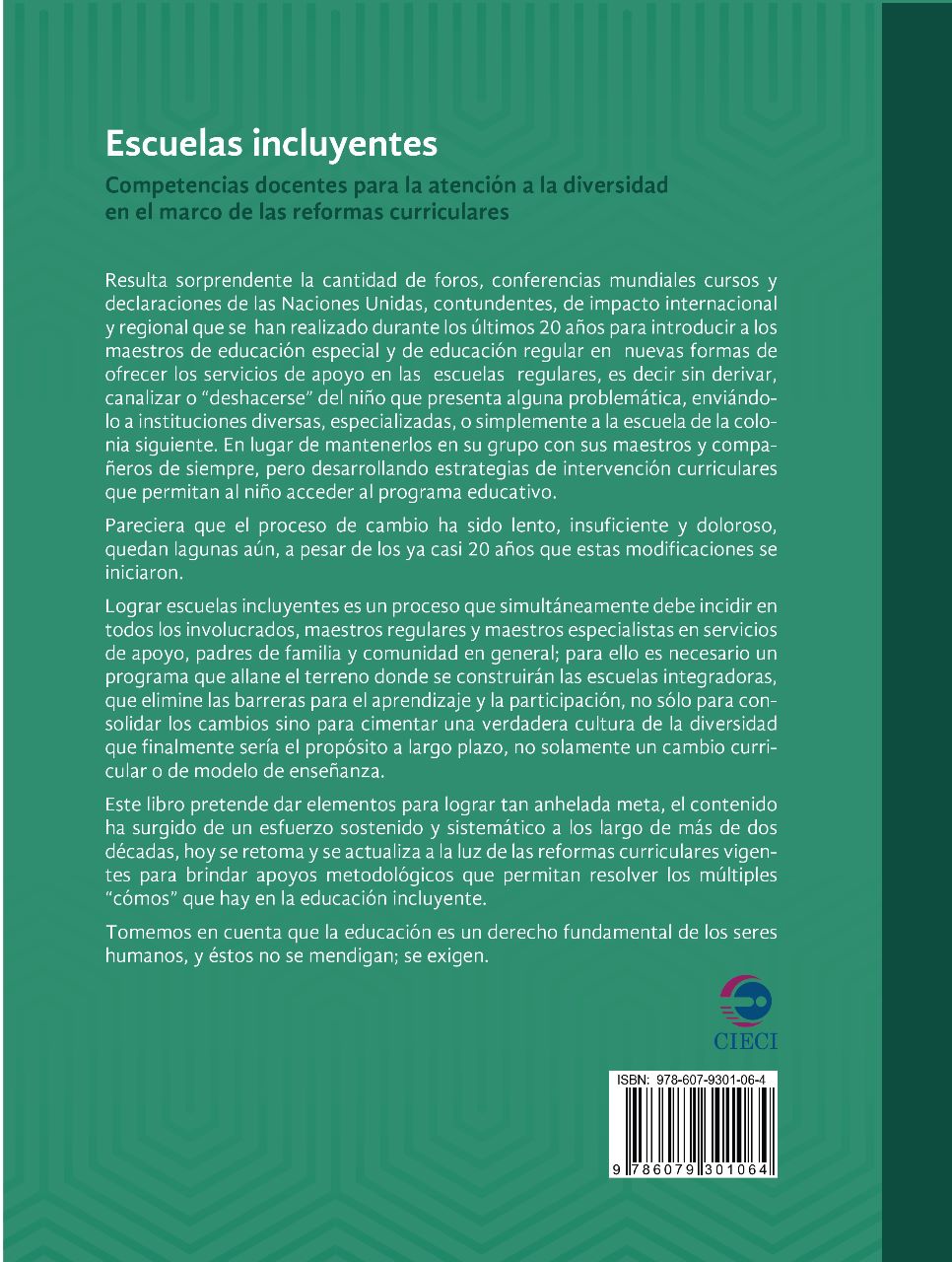 Este libro pretende dar elementos para lograr tan anhelada meta, el contenido ha surgido de un esfuerzo sostenido y sistemático a lo largo de más de dos décadas, hoy se retoma y se actualiza a la luz de las reformas curriculares vigentes para brindar apoyos metodológicos que permiten resolver los múltiples “cómos” que hay en la educación incluyente.